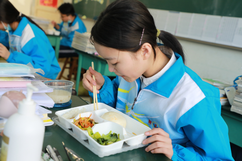 学生就餐实行配餐制。学校食堂把餐食统一送到教学楼,各班级派代表依次领取,学生在教室用餐,把学生聚集的可能性降到最低。