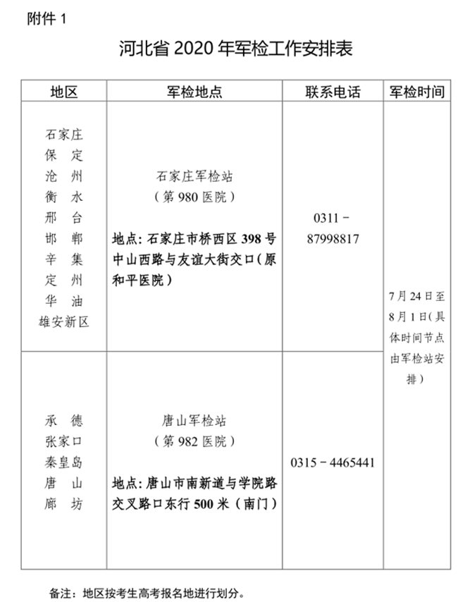 军检包括面试、体格检查和心理检测,由省军区战备建设局统一组织。全省设石家庄和唐山2个军检站,分别由所在地军分区(警备区)负责组织实施,全省各地考生具体的军检地点区域安排见附件1(按照考生高考报名地区分)。军检时间为7月24日至8月1日(含复检时间),具体安排由各军检站军分区(警备区)安排。期间,省军区战备建设局派出巡视员对各军检站进行检查指导。考生参加军检,需携带本人身份证、高考准考证。省军区战备建设局制定军检工作手册,明确军检工作流程、标准条件、复议程序、申诉渠道、结论查询等,并通过省教育考试院网站公布,考生可从网站下载或在军检现场领取。