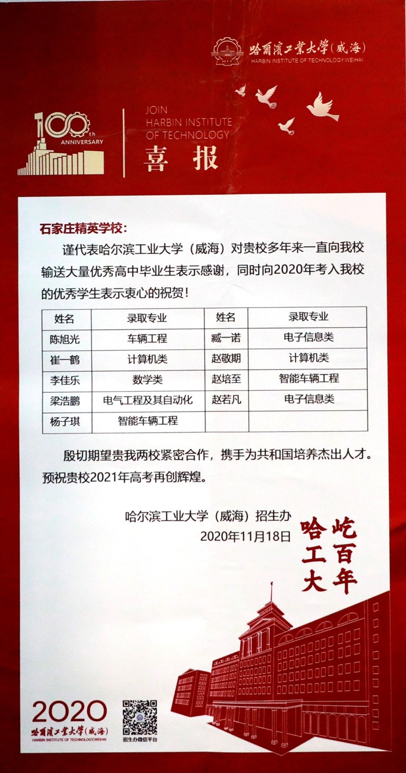 近日,国家“985工程”重点建设大学、中国“C9联盟”高校成员、国家“双一流”建设A类高校哈尔滨工业大学(威海)向澳门金年会app下载官网发来喜报,祝贺我校陈旭光、崔一鹤、李佳乐、梁浩鹏、杨子琪、臧一诺、赵敬期、赵培至、赵若凡等九名同学被哈工大(威海)录取。