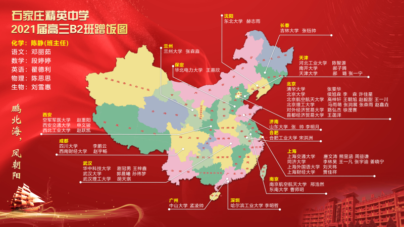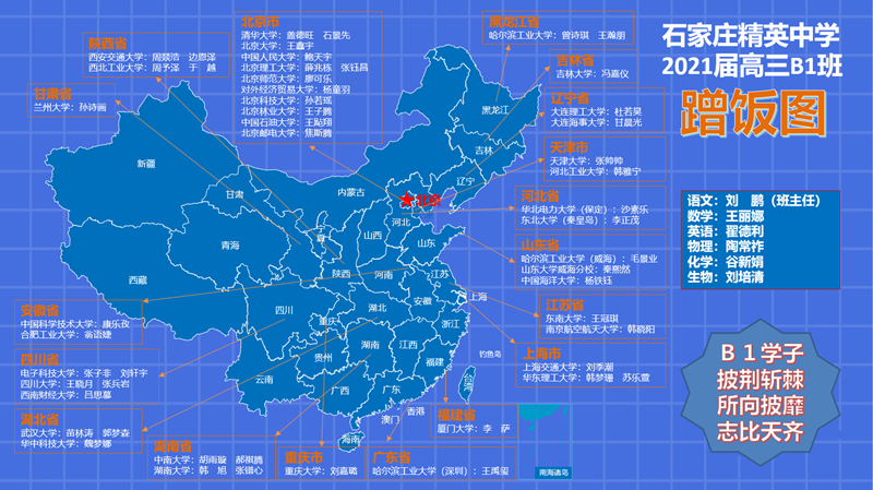 2021届高三B1班,全班51人,其中2018年中考成绩不足580分、在石家庄市排名2400多名的有17人,占全班总人数的三分之一;其中还有两人的中考成绩排名甚至在全市七千多名。这个班是一个特别团结的班集体,同学们关系和谐、互帮互助,人人爱班级,个个有担当,凝聚起强大的班集体力量。他们考取名校的信念异常坚定,每次考试结束都会将成绩与目标大学进行对比,一步步强化了非名校不上的信念,也坚定了非“双一流”不走的决心。他们坚信,英雄往往是以集体的形式出现,唯一能让自己站稳的依靠就是自己的班级。果然,这个集体创造了属于他们的奇迹:全班51人全部考入“双一流”建设高校,无一人掉队;13名同学考入“C9联盟”高校;盖德旺、石景先、王鑫宇等3人考入清华大学、北京大学。