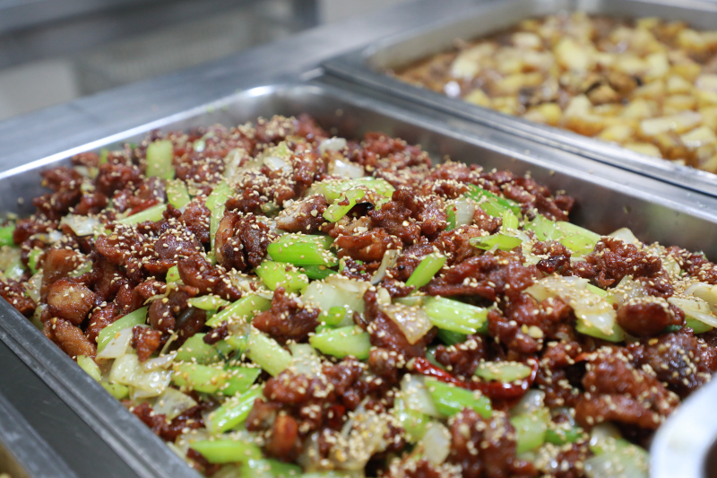 食堂的饭菜种类丰富,荤素搭配,营养均衡,价格实惠。我的午餐一般是一份米饭、两荤一素,只需花费八元,菜品量足味美,完全可以吃饱吃好。现在食堂新添加了刷脸系统,智能支付非常方便。食堂里有很多电视,吃饭的时候,我们可以观看时事新闻,随时了解国家大事、世界发展。