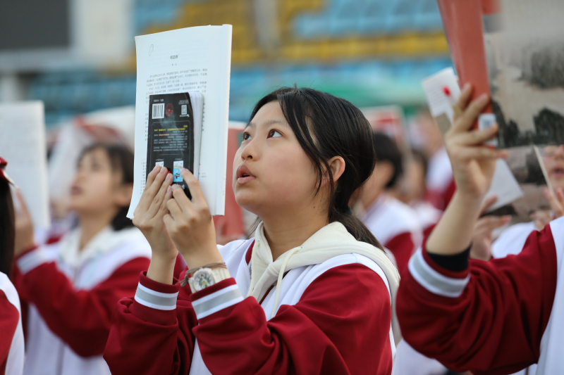 当清晨的第一缕阳光刚刚穿透黎明,我们已经来到运动场,高举书本,大声朗读,清亮的读书声飘荡在校园的四面八方。如果看过全校数千人一起早读的场面,那你一定会大为震撼。每个人都全神贯注,忘我读书,眼中放射的是光芒,双手紧握的是梦想。每天的早读,不仅巩固了我们对基础知识的掌握,更让我们激情满满地开启崭新的一天。