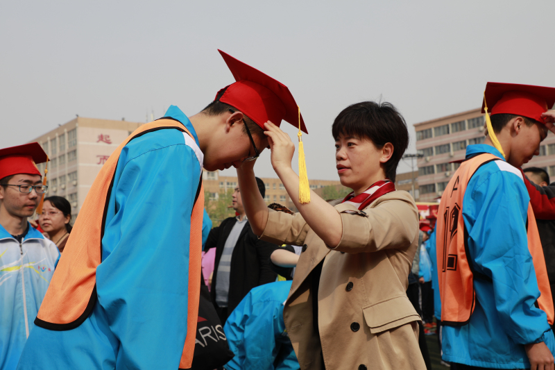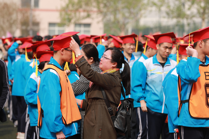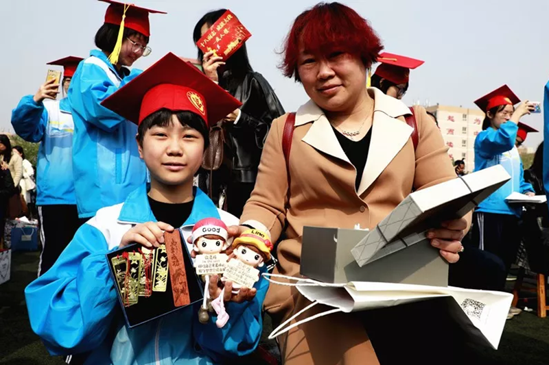 家长们拿起手中的成人帽,郑重地为孩子加冠。