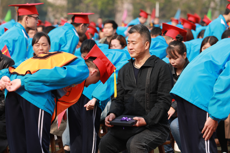 “冠者拜父母,感念父母养育之恩……” 仪式上,学校领导代替无法到场的家长,为学生带上成人帽。