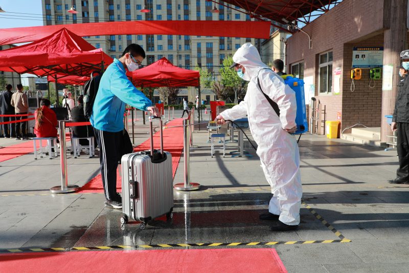 学校实行错时返校,分批分班报到。返校学生在老师的指引下,保持安全距离排队通过消毒测温通道进入学校。