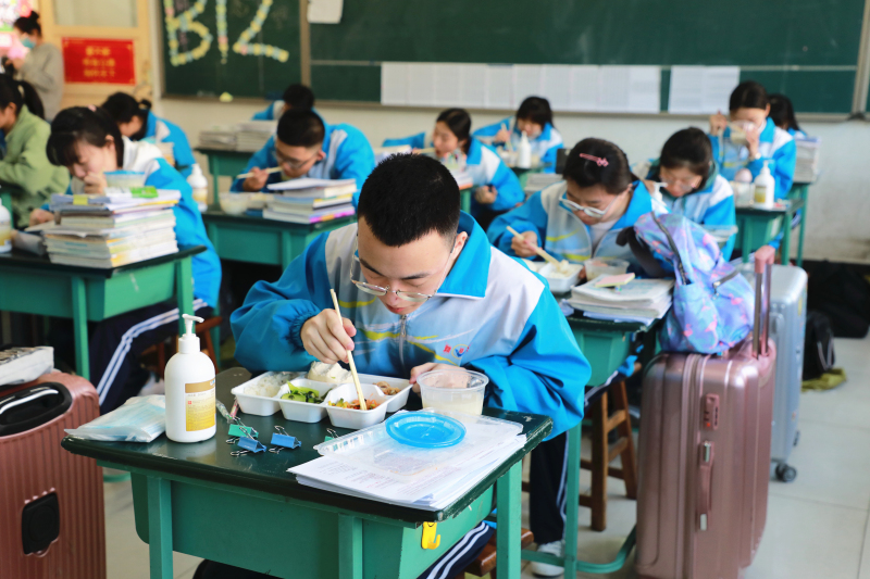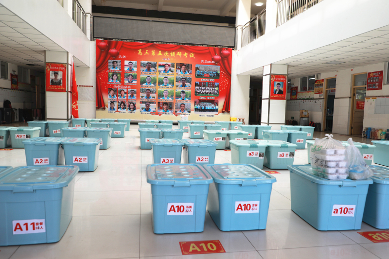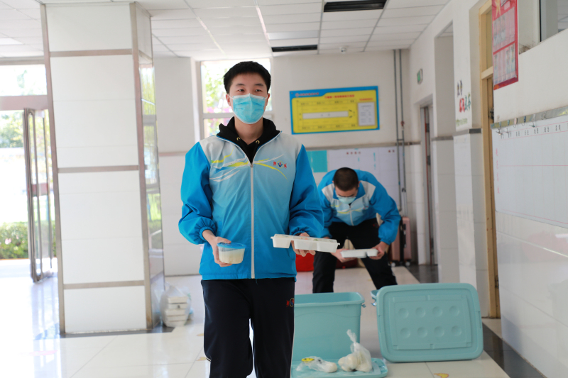 学生就餐实行配餐制。学校食堂把餐食统一送到教学楼,各班级派代表依次领取,学生在教室用餐,把学生聚集的可能性降到最低。