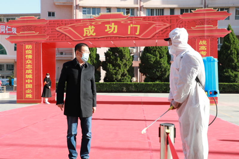 在学校门口,李金池校长就消杀行李、检测体温等工作进行指导。