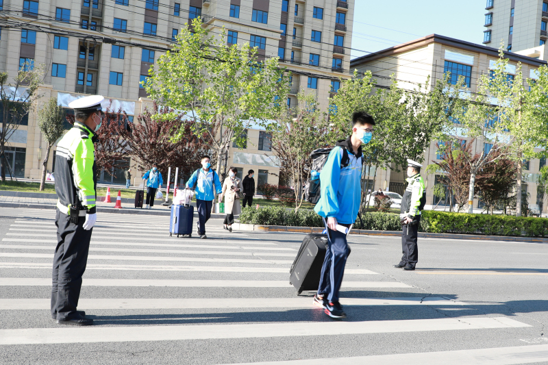 清晨7:00,高三学生陆续抵达。学苑路上,由交警和教职工组成的志愿者引导学生有序向学校行进。