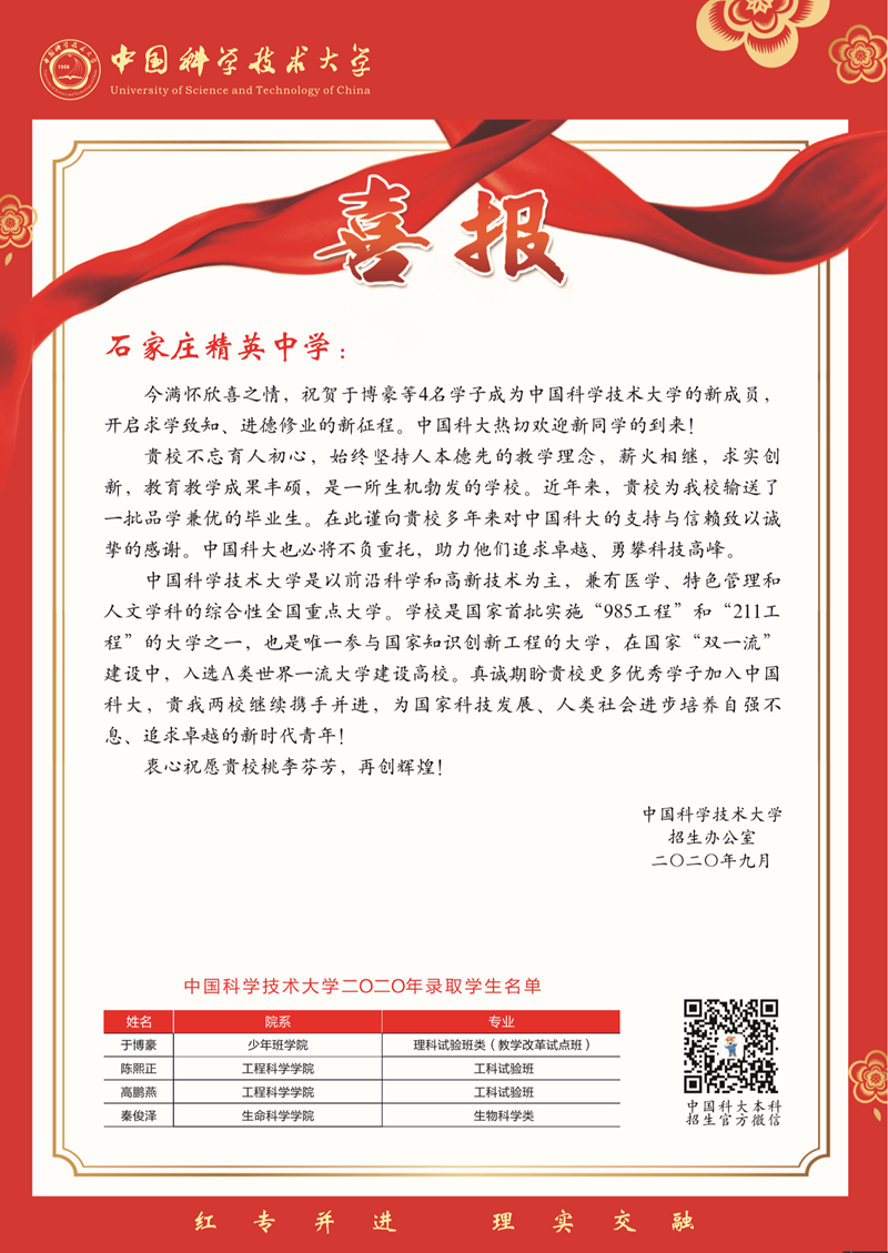 喜报称,澳门金年会app下载官网不忘育人初心,始终坚持人本德先的教学理念,薪火相继,求实创新,教育教学成果丰硕,是一所生机勃发的学校。中国科大感谢我校为其输送了一批品学兼优的毕业生,表示必将不负重托,助力他们追求卓越,勇攀科技高峰。