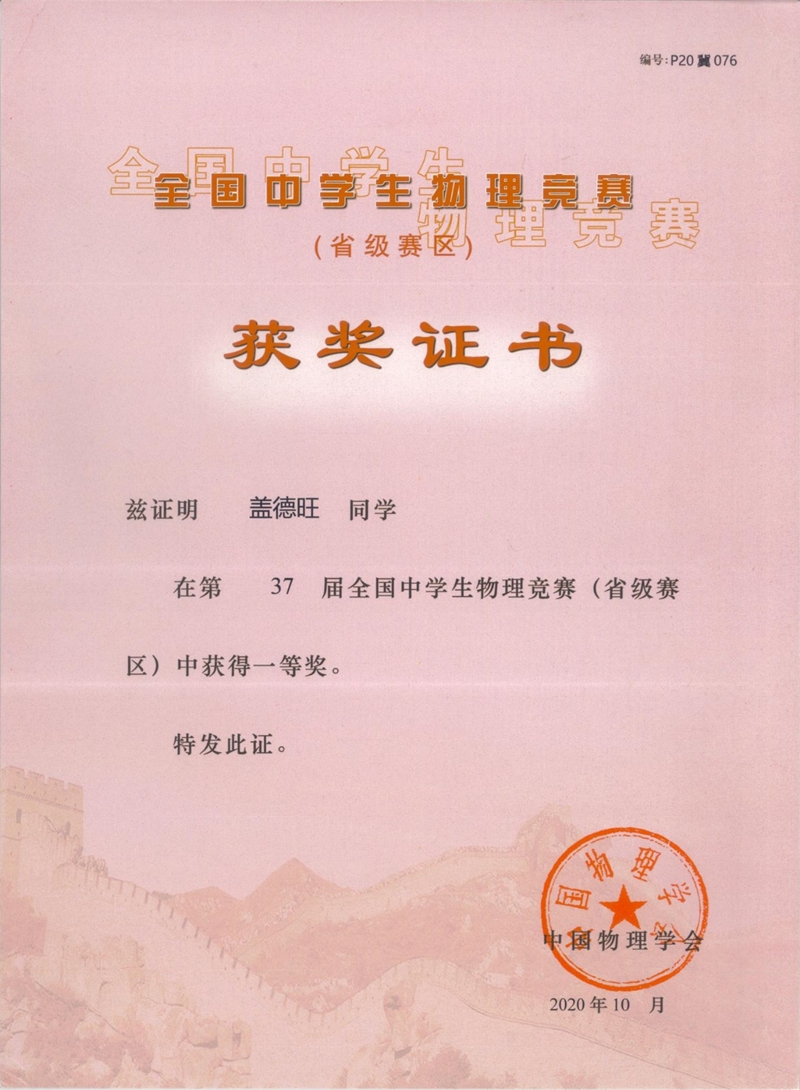 喜讯|澳门金年会app下载官网盖德旺荣获全国中学生物理竞赛省一等奖