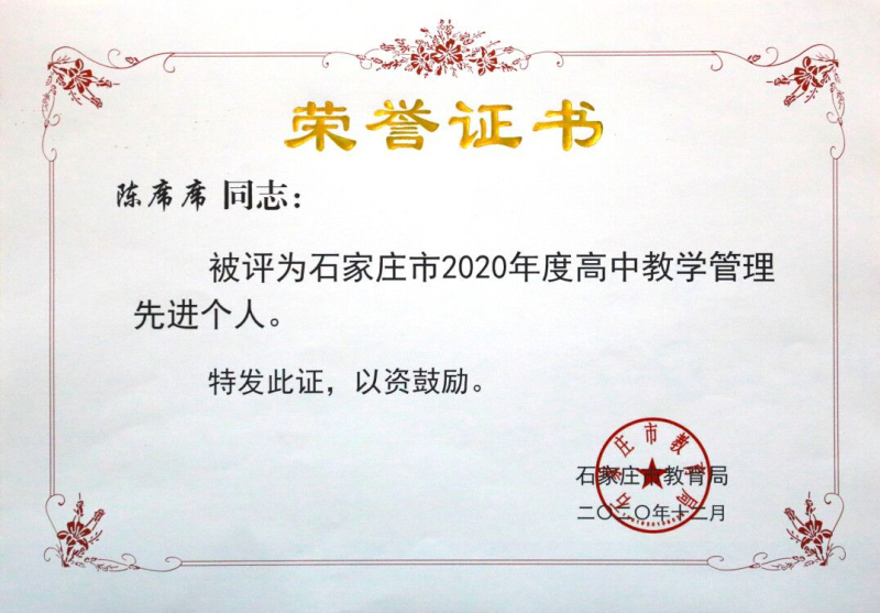 在石家庄市教育局组织的2020年度全市高中教育工作先进单位及先进个人的评选活动中,我校再次荣获“高中教学先进单位”荣誉称号。陈席席、赵叶凡两位老师分别获得“石家庄市2020年度高中教学管理先进个人”荣誉称号。