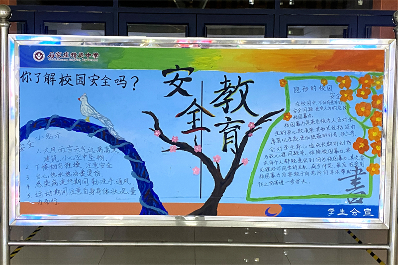 学校从上周开始,就通过电子屏为学生播放了国家安全、校园安全的教育视频,特别对校园霸凌、校园防踩踏、交通安全等做了重点宣传。学生会利用课余时间精心制作了宣传展板,通过多种途径让学生了解到危害来临时应急避险的方法,做到每位学生都将安全铭记于心。